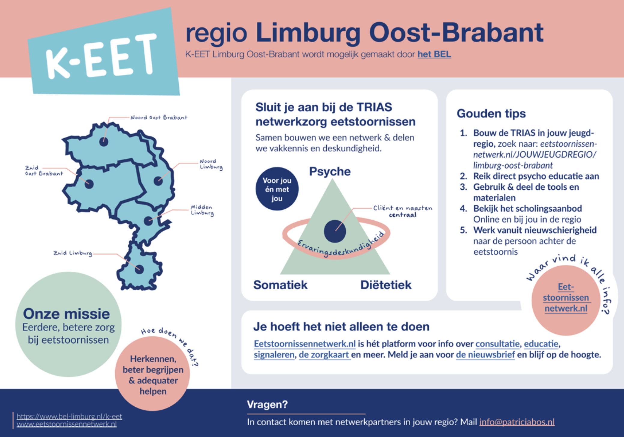 De ontwikkelingen die door het programma ‘K-EET bouwt door’ landelijk worden vorm gegeven lees je op het online platform www.eetstoornissennetwerk.nl. Hier vind je tevens meer informatie over eetstoornissen en een actuele sociale kaart voor het behandelaanbod en informatie over de K-EETI (informatielijn voor professionals).